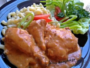 Ha megpuhult, szűrőkanállal óvatosan kiszedjük a csirkedarabokat, és a levét behabarjuk a liszttel elkevert tejföllel. Kiforraljuk, és visszatesszük bele a húst.