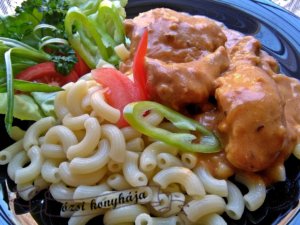 Galuskával vagy főtt tésztával /szarvacska, orsó/ tálaljuk.
