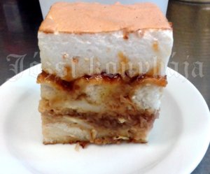 Közben a tojások fehérjét cukorral és két evőkanál lekvárral kemény habbá verjük. Ha megsült, hagyjuk kicsit hűlni, majd rákenjük a fehérje habot és a sütőbe visszatéve még 15-20 percet sütjük.