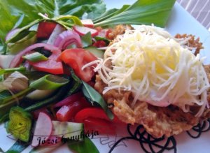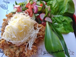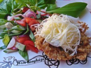 Tálalásnál a húsra teszünk a medvehagymás tejfölből, majd reszelt sajtot szórunk rá.