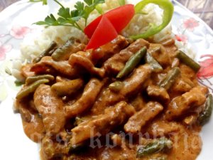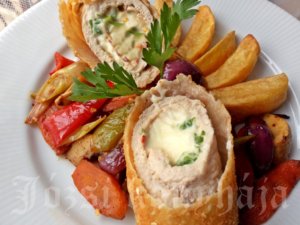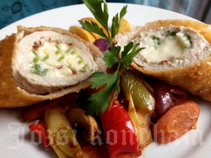 A combfilét két nejlon zacskó között óvatosan kiklopfoljuk. A húst sózzuk, szárnyas fűszerrel megszórjuk. A paprikát és az újhagymát apróra vágjuk. A kiterített csirkecombokra szórjuk a paprikát és az újhagymát, ráteszünk egy-egy szelet trappista sajtot és egy-egy evőkanál krémsajtot.